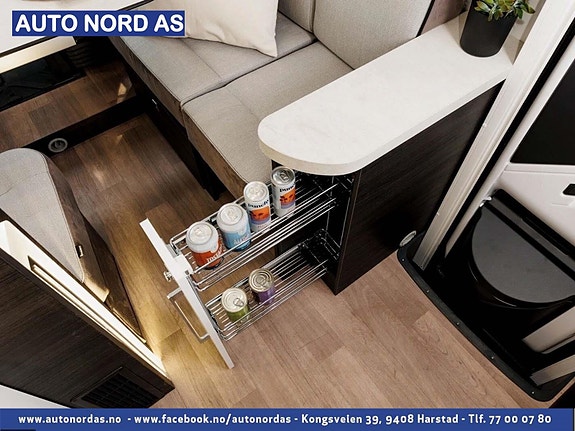 I førerdel har man Aircondition, koppholdere, USB, DAB radio med stor dobbeldin skjerm. Radioen har innebygget CarPlay, som er en smartere og tryggere måte å bruke telefonen i bobilen på, så du kan konsentrere deg om trafikken. Når du kobler telefonen til CarPlay, kan du få veibeskrivelse sving for sving, ringe ut, sende og motta meldinger, høre på musikk med Spotify, ryggekamera, multifunksjonsratt i skinn, Gardiner til formørkning, Regulerbare pilotstoler med armlene, varme i speil og det er også regulerbart ratt. Denne bobilen oppleves nærmest som en flott personbil.