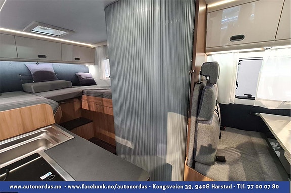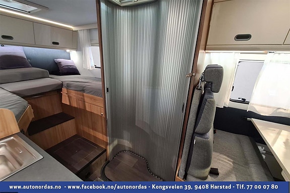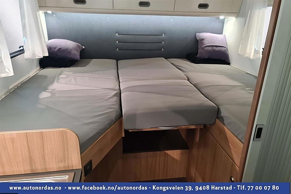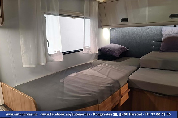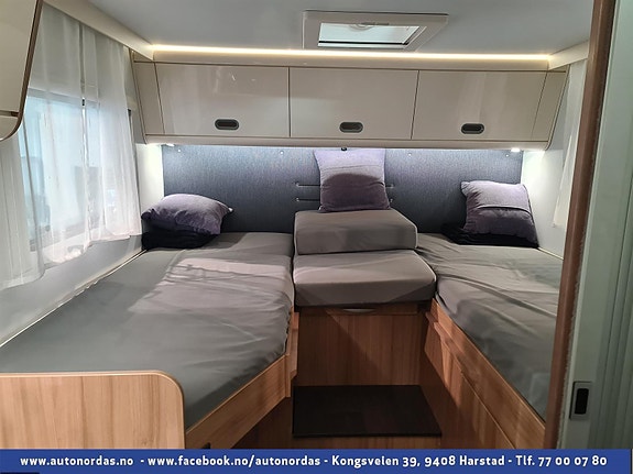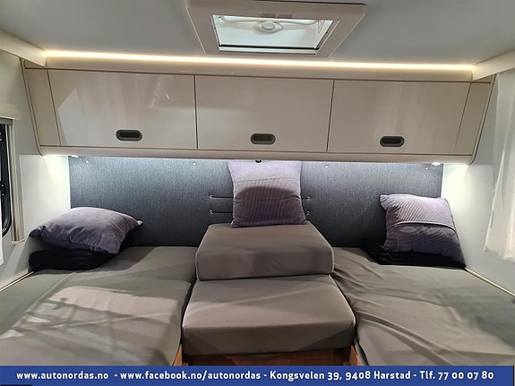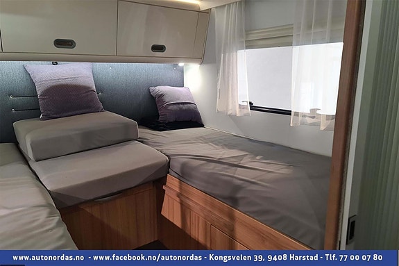 Helt bak i bobilen er 2 langsgående senger, som med enkle grep kan omgjøres til stor dobbelseng. Godt med skapplass for oppbevaring av klær.