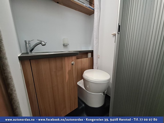Meget smart løsing på bad for god plassutnyttelse i bobilen. Trekkspilldør som svinges inn på bad når dette ikke er i bruk, noe som gir svært romslig gulvplass utenfor.