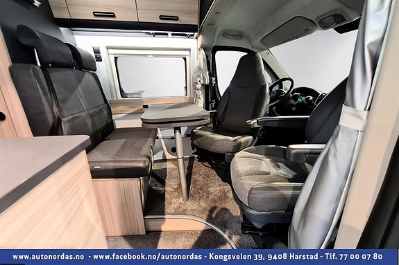 Bobilen er innredet i flotte fargekombinasjoner. Salong er trekt i delskinn og har romslig plass for 4 personer.