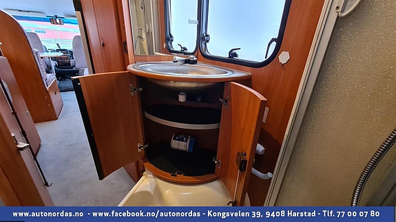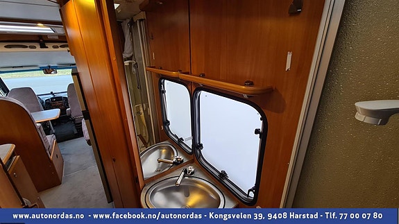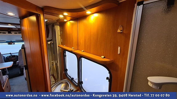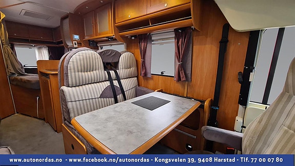 Stor sittegruppe med plass for hele familien rundt bordet. Lyse fine farger på stoff og interiør. Formsydde tepper i hele bilen. Godt med skapplass over salongen og i sittebenkene.