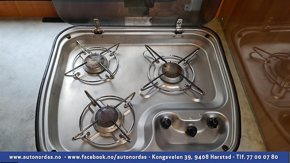 Stor kjøkkenbenk med vask og 3 stk gassbluss. Store skap for oppbevaring. Montert uttrekkbart kurvstativ i ene skap for å utnytte plassen maksimalt. Nytt stort kjøleskap med egen separat frys montert i 2020. Dørene på dette kan åpnes fra begge sider.
